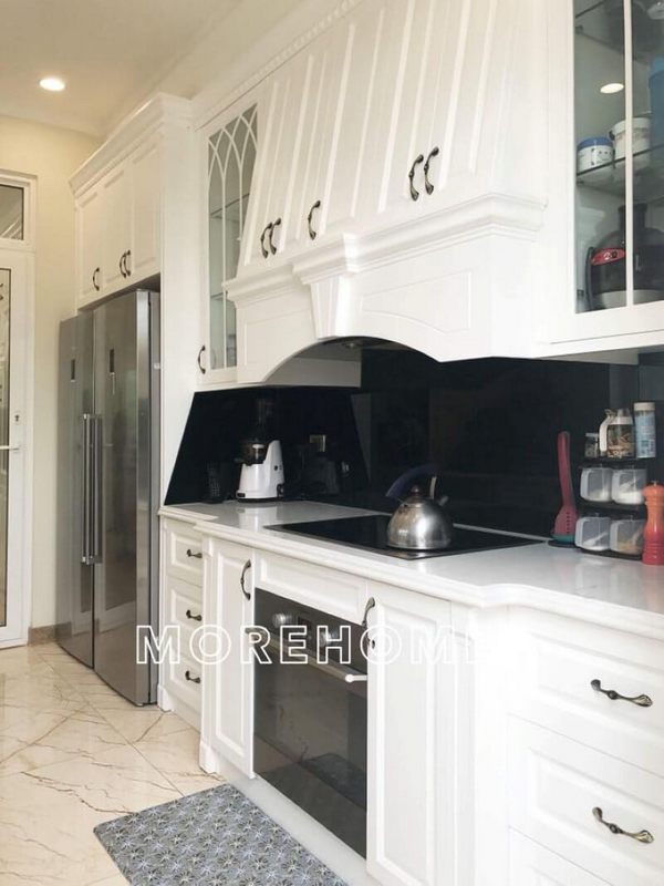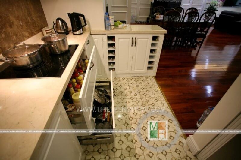 Hình ảnh thực tế của tủ bếp tân cổ điển được phun sơn trắng tại biệt thự Ciputra, Tây Hồ, Hà Nội đã được thi công.